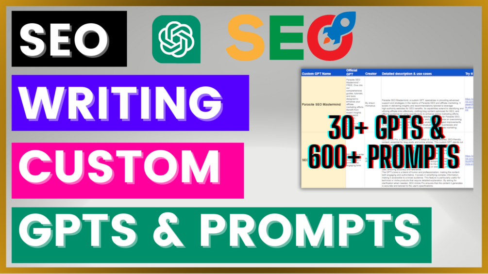 - AI SEO Writing & Blogging Custom GPTs & Prompts: Over 30 GPTs with 600+ prompt examples.